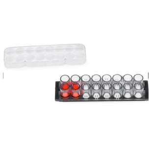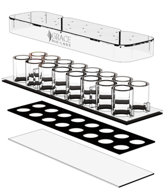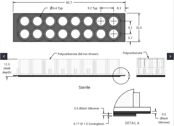 蓋玻片上的腔室共16個(gè),分2排,各8孔(如圖示),每孔的內(nèi)直徑6mm。設(shè)計(jì)的每孔體積和孔距與標(biāo)準(zhǔn)96孔板的相同,無(wú)細(xì)胞毒性的硅膠孔墊片(silicone well gasket)與上層聚苯乙烯材料的腔室(the upper structure,厚0.5mm)和基層的硼硅酸鹽蓋玻片(the substructure,厚0.16-.19mm)形成滴水不漏的密封。有上層腔室時(shí)每孔體積250µl,去掉上層腔室后每孔體積9µl。