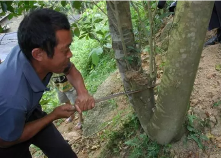 用砍傷法讓沉香樹快速結香的方法,是最常用的一種人工造香方法??硞ㄐ枰x擇6-8年以上胸徑10厘米以上的沉香樹,然后,在距離地面1.5米的地方,順砍數刀,刀與刀之間的距離約30-40厘米左右,傷口深約3-4厘米左右。